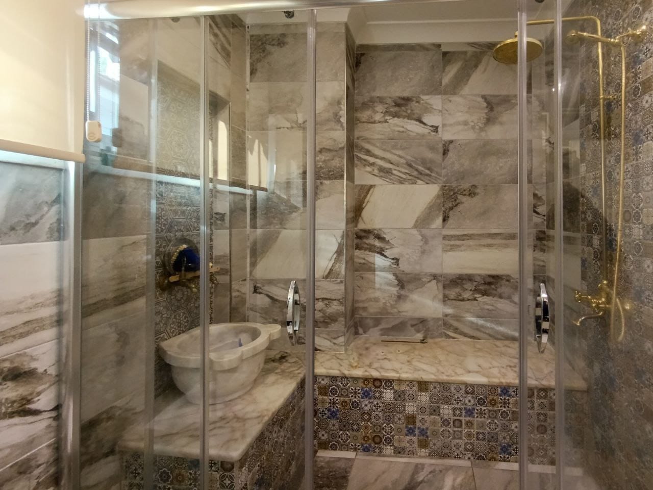 Bu özel köşk, Türk hamamı konseptiyle tasarlanmış lüks bir banyo sunuyor. Geleneksel estetiği modern konforla birleştiren bu alan, günün yorgunluğunu atabileceğiniz, ruhunuzu ve bedeninizi şımartabileceğiniz özel bir kaçış noktası. Kendi evinizin konforunda gerçek bir hamam deneyimi yaşayacak, huzur ve dinginliğin keyfini çıkaracaksınız.